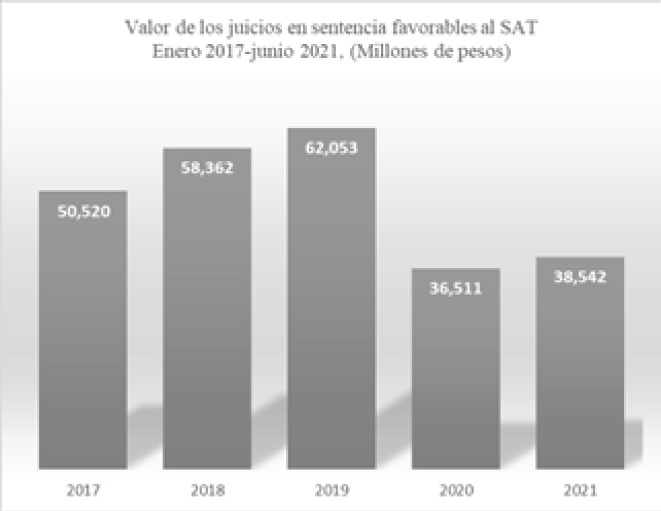 Afirma Rodríguez (2020), que durante el ejercicio fiscal 2018, el Servicio de Administración Tributaria (SAT) “presentó contra grandes contribuyentes 290 juicios fiscales con sentencia definitiva por 11 mil 457 millones de pesos, de los cuales ganó 190 juicios (65.5%) por un monto de 7 mil 301.8 millones de pesos (64 por ciento) y perdió 100 juicios (34.5 por ciento) por 4 mil 155.2 millones de pesos (36 %)”. En cuanto a los motivos por los cuales la autoridad pierde juicios, se ha identificado que un 63% se originó por asuntos relacionados con devoluciones y créditos fiscales, mientras que 37 por ciento se relacionó principalmente con multas, en cumplimiento de juicio de nulidad y el trato arancelario preferencial.