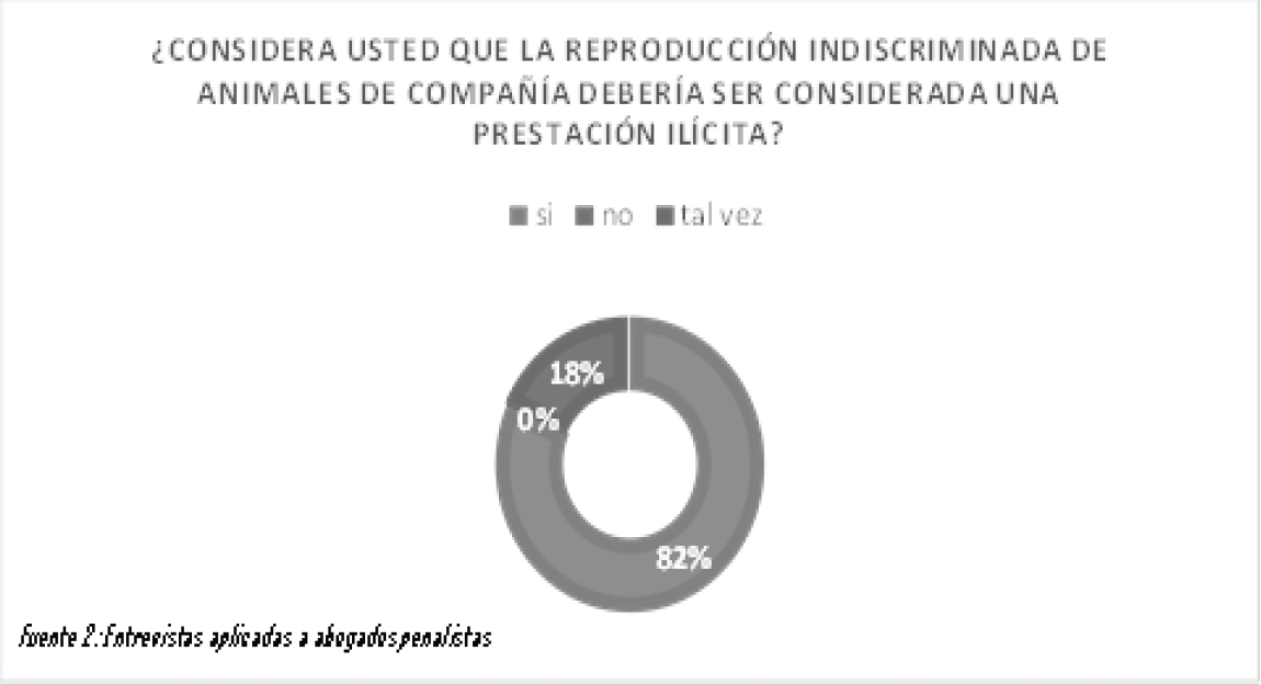 En base a nuestro segundo objetivo específico, que consiste en identificar si uno de los supuestos de prestación ilícita, es la reproducción indiscriminada de animales, según los hallazgos de los datos recolectados a través de las guías de entrevista, la mayoría de los especialistas en derecho penal (82%) consultados, indicaron que la reproducción indiscriminada de animales de compañía, si es un supuesto de prestación ilícita (verGráfico 1), y, lo anteriormente descrito, coincide con lo mencionado Alas (2015), para quien la prestación ilícita es una conducta que contraviene el marco normativo vigente, que busca recibir una contraprestación prohibida por la ley, y que estas situaciones quedan fuera del alcance de la protección que ofrece la norma; y, los especialistas entrevistados consideran que la reproducción indiscriminada de animales debería ser considerada ilícita, lo que implica que va en contra de las normas o principios legales y éticos establecidos, además que mencionan frecuentemente el fin de lucro económico como un criterio para considerar esta práctica como ilícita. Así mismo Zuriñe (2020), al momento de definir la reproducción indiscriminada de mascotas para su comercialización, nos menciona que este tiene por propósito “únicamente obtener ganancias económicas”.