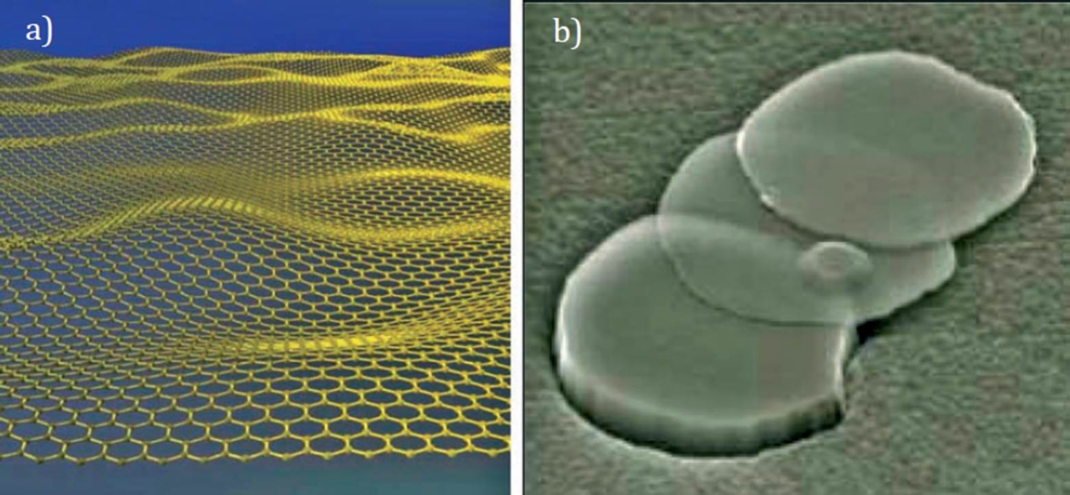 Figura 1 a) Imagen esquemática a escala atómica del grafeno; b) imágenes de grafeno obtenidas con un microscopio electrónico de barrido (escala de micras).