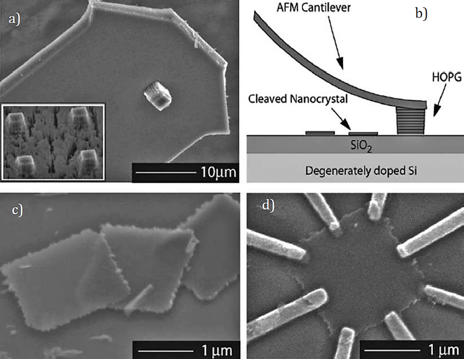 Figura 2 a) Imagen de una muestra de grafito tomada con un microscopio electrónico de barrido (MEB); b) esquema del proceso de exfoliación del grafito para sintetizar grafeno; c) muestras de grafeno sobre un sustrato de SiO2 y, d) dispositivo experimental de grafeno con contactos de oro para medir sus propiedades de transporte (tomado de Zhang et al., 2004).