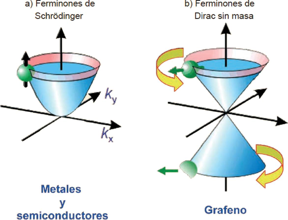 Otra similitud entre los portadores del grafeno y “los fermiones de Dirac sin masa” de la electrodinámica cuántica es la conexión entre el movimiento de estas partículas y la dirección de su espín. En ambos casos, el espín de la partícula (electrón) tiene la dirección del movimiento de propagación, y la “antipartícula” (hueco) la dirección opuesta del movimiento de propagación, tal y como se observa en la Figura 5. Esta situación es única en materiales, pues usualmente una partícula de espín ½ y masa m, como los electrones, pueden tener sólo espín hacia arriba y hacia abajo. Ésta es la conexión maravillosa con la electrodinámica cuántica: los portadores en el grafeno se comportan como partículas cargadas sin masa y sus espines tienen “simetría conjugada”. Este comportamiento de los electrones en un material no se había observado previamente y, más importante aún, podría ser aprovechado para innovaciones tecnológicas.