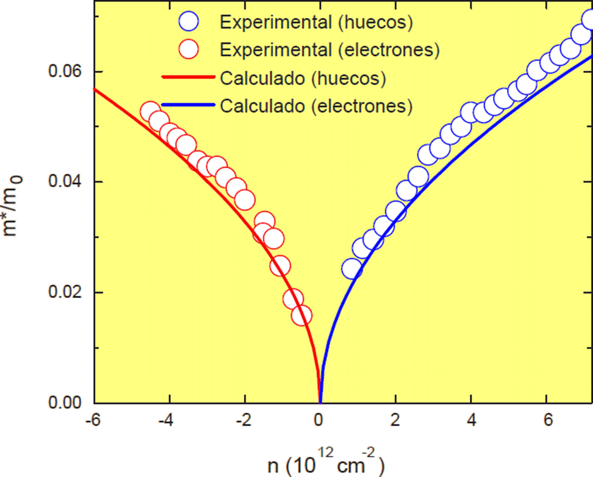 Figura 6 Masa ciclotrónica de los portadores de carga (electrones o huecos) en grafeno como función de su concentración (n). Los círculos azules corresponden a los datos experimentales que se midieron para los electrones y los círculos rojos para los huecos (Novoselov et al., 2005) Las líneas sólidas corresponden a las masas ciclotrónicas calculadas (Cifuentes-Quintal et al., s/f)