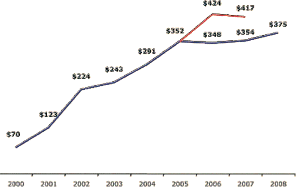 Obviamente, el destino de los fondos públicos es importante. No es lo mismo invertir en nanociencia, nanomedicina o nanoelectrónica que en nanotecnología militar. El gráfico de más abajo8 muestra la evolución del gasto militar en nanotecnología durante la “era Bush”, dándose la circunstancia de que en los últimos años la financiación real aprobada por el Congreso (línea roja) ha superado a la financiación solicitada por el propio Departamento de Defensa de los Estados Unidos (línea azul).