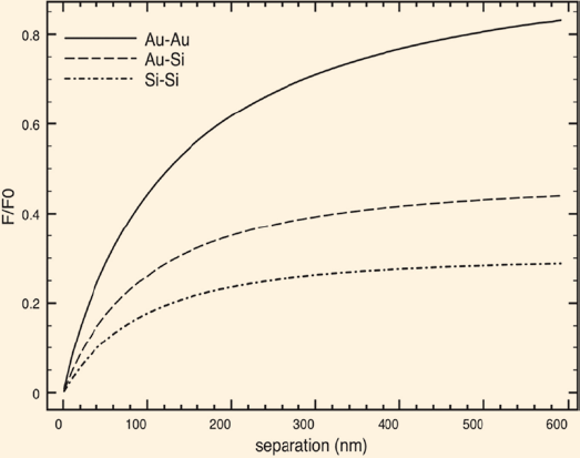 Por ejemplo, se puede calcular la fuerza entre dos placas de oro, de silicio o de cualquier material. La fuerza de Casimir es mayor para metales. Un ejemplo del cálculo de la fuerza lo presentamos en la Figura 3. Para dos placas de oro (Au) se obtiene la fuerza más grande [4], para la placa de Au y Si disminuye porque el Si no es un buen conductor y finalmente, al tener las dos placas de Si se obtiene el valor más pequeño para la fuerza. Dicho de otra manera, la teoría de Lifshitz nos permite concluir que entre más luz refleja un material mayor será la fuerza de Casimir.