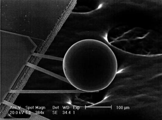Figura 4 Punta de microscopio de fuerza atómica con esfera pegada para la medición de la fuerza de Casimir. Foto tomada de la referencia [6].