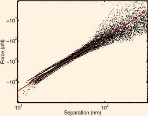 La fuerza de Casimir se mide en pico Newtons es decir una billonésima de Newton.1 Para darnos una idea de esto, la fuerza que ejercemos al oprimir el botón de un bolígrafo para sacar la punta es de 1 Newton aproximadamente. En la Figura 6, se puede observar una curva típica de medición de la fuerza de Casimir. Estas mediciones fueron realizadas con un microscopio de fuerza atómica. En esta figura, los puntos negros son varias mediciones que se realizaron y la línea roja es la predicción usando la fórmula de Lifshitz. Como vemos el promedio de las mediciones coincide con la teoría [8].