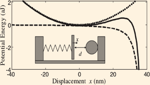 A las escalas que operan los mems, las fuerzas de Casimir juegan un papel importante. Recordemos de la sección de experimentos que el dispositivo en la Figura 4 es de hecho una micromáquina. Con el dispositivo de dicha figura, la fuerza de Casimir sólo se puede medir hasta una distancia mínima de unos 5 nm. ¿Por qué? Si en un dispositivo como el mostrado en dicha figura, acercáramos la esfera al plano por debajo de los 5 nm ocurre el llamado salto a contacto. La esfera y el plano se pegan y el dispositivo queda dañado permanentemente. En este caso hay dos fuerzas que actúan sobre la microbalanza de la Figura 4. Una es la fuerza de Casimir y la otra es una fuerza de restitución elástica que trata de regresar la micro balanza a su posición horizontal que es la de equilibrio. Cuando la fuerza de Casimir es mayor que la elástica sucede el salto a contacto. Para ilustrar más claramente el efecto del salto a contacto en la Figura 8 mostramos un esquema de un sistema con las dos fuerzas compitiendo. La fuerza elástica, cuya energía potencial es la línea punteada y la fuerza de Casimir representada por la línea rayada. La suma de las dos es la línea sólida que muestra una barrera de potencial aproximadamente a 30 nm en la figura. Para todos los puntos a la derecha de esta barrera, la fuerza de Casimir es mayor que la fuerza elástica (precaución, la figura muestra energías potenciales no fuerzas) y se da el salto a contacto.