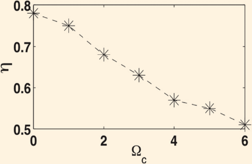 Esta idea de controlar la fuerza de Casimir con campos magnéticos externos fue propuesta en una colaboración entre la UNAM y la Universidad Autónoma de Puebla [10]. Usando semiconductores como InSb o AsGa se logró disminuir la fuerza de Casimir al aplicar un campo magnético paralelo a las superficies. En la Figura 9 se puede ver cómo disminuye la fuerza de Casimir con el campo magnético. Para entender la figura hay que definir algunas cantidades: en el eje vertical graficamos el factor de reducción definido en la ecuación 2, y en el eje horizontal graficamos Ωc que es una frecuencia adimensional directamente proporcional al campo magnético aplicado. Es decir, cuando el campo magnético es cero la frecuencia Ωc es cero y al aumentar el campo magnético, la frecuencia Ωc también aumenta.