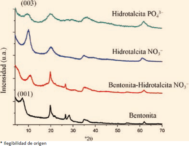 Debido a que el ion amonio, NH4+ (presente en el hidróxido de amonio, NH4OH), también puede ser una fuente de nutriente para las plantas, se puede recuperar mediante el uso de una arcilla catiónica u otro material intercambiador de cationes, como las zeolitas. Ya sea después o durante la preparación de las hidrotalcitas. En nuestro caso, se empleó una bentonita comercial, una montmorillonita, que al ponerse en contacto con las soluciones acuosas que contiene iones NH4+, éstos se intercambian por los cationes de potasio y calcio presentes en la arcilla. Sin embargo, la capacidad de retención de los iones NH4+ dependerá en gran medida de la capacidad de intercambio catiónico de la arcilla, que es de aproximadamente 100 meq/100g. Por lo tanto, se decidió sintetizar a pH=9, una hidrotalcita o arcilla aniónica de Mg-Al con nitratos, tal y como se describió anteriormente. Pero ahora, la mezcla de sales metálicas y del agente precipitante, no están solas. En efecto, una mezcla de una arcilla catiónica y agua desionizada se utilizó durante la síntesis. La relación molar de Bentonta-Hidrotalcita-NO3- fue de 50:50. Con ello se pretende, primero, recuperar una parte de los iones NH4+ presentes en el hidróxido empleado para llevar a cabo la coprecipitación de las sales de Mg y de Al, y segundo, los iones nitratos presentes en la arcilla catiónica.