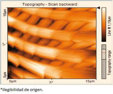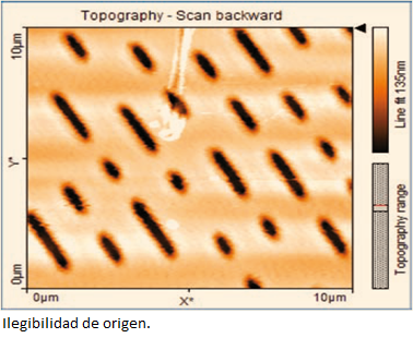 Usando el microscopio de fuerza atómica (AFM, por sus siglas en inglés) para la medición de muestras con patrones nanométricos, se introduce a los aprendices a los fundamentos del AFM, su operación, sus limitaciones y requerimientos (ver Imagen 2). El objetivo aquí es usar muestras de fácil accesibilidad como es un CD. En la Imagen 3: “Topografía de un CD de datos tomada con el AFM”. Se muestra la Imagen sobre la cual los aprendices definen formas, separaciones y dimensiones de patrones entre pistas. Esta muestra, además, permite ilustrar a los aprendices cómo la información digital es almacenada como documentos, videos, música, entre otros datos, y se les explica cómo se representa esta información en bits, que es la unidad más pequeña de información.