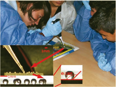 En esta actividad se evalúa la comprensión de las nanoescalas introducidas en las prácticas iniciales y a partir de aquí se avanza en el uso del microscopio para estudiar propiedades a nanoescala como es la hidrofobicidad (capacidad de un material de repeler el agua y no permitir la adherencia en éste.)