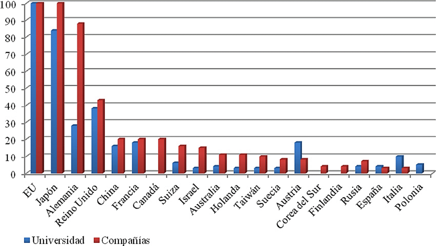 Cabe señalar que a nivel mundial, los países que tienen mayor número de patentes coinciden con los que tienen un mayor número de compañías, universidades y centros públicos de investigación. Asimismo, coincide que aquellos países con altos montos de presupuesto para la investigación y desarrollo son los mismos países como es el caso de Estados Unidos que cuenta con fondos federales, estatales y privados para la actividad en nanotecnología.