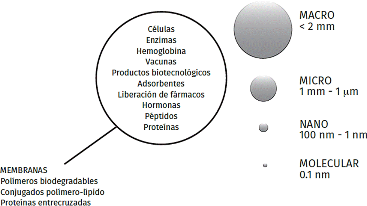 Los tamaños de las células artificiales ahora oscilan entre las macrodimensiones, microdimensiones, dimensiones nanométricas y las dimensiones moleculares (Figura 4), (Chang, 2005).