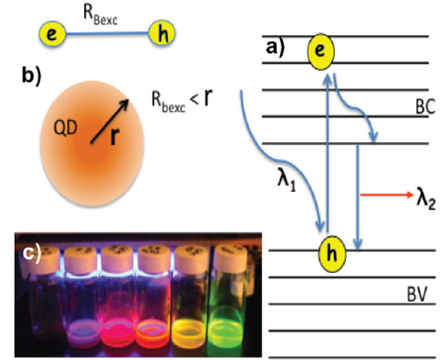 Figura 1 a) Diagrama esquemático que muestra la discretización de las bandas de energía y el ensanchamiento de la banda prohibida para un punto cuántico, λ1 se refiere al fotón que excita el electrón de la banda de valencia a la banda de conducción y λ2 se refiere al fotón (fluorescencia) que resulta de la recombinación del par electrón-hueco; b) diagrama esquemático que muestra el radio de Bohr del excitón (RBexc) y un punto cuántico de radio r; c) fotografía de puntos cuánticos de CdSe con diámetros entre 3 y 6 nm, obtenidos en nuestro laboratorio por el método de inyección caliente ampliamente reportado en la literatura, ver, por ejemplo (Bera et al., 2010; Pu et al., 2018; Yang et al., 2015).