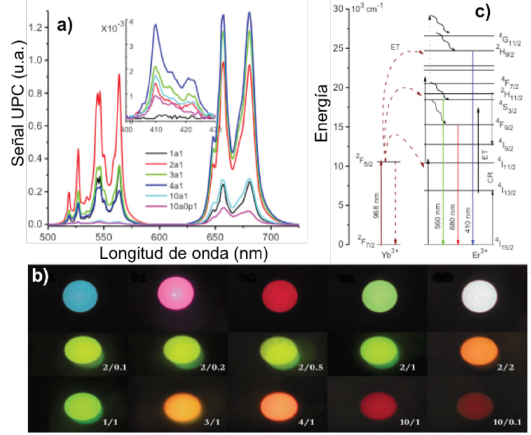 Figura 2 a) Se muestran las bandas de emisión verde y roja del Er3+ después de ser excitado a 980nm, a diferentes concentraciones de Yb3+; b) fotografía de los diferentes colores que es posible obtener mediante la combinación adecuada de Ln3+; la última línea de colores es el resultado de variar la concentración de Yb3+ a una concentración fija de Er3+, la penúltima corresponde a una variación de la concentración de Er3+ a una concentración fija de 2mol% de Yb3+, mientras que la antepenúltima línea, de izquierda a derecha, se obtiene utilizando Tm3+ (azul y rosa), Er3+ (verde y rojo) y la luz blanca se obtiene combinando Yb3+, Er3+, Tm3+; c) diagrama de energía característico del Yb-Er.