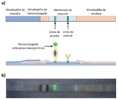 Figura 5 Diagrama esquemático de una tira de flujo laminar (a), así como la fotografía de una tira con una línea de control positiva usando nanopartículas con conversión ascendente (b).
