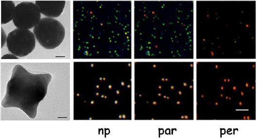 Nota: A la izquierda del panel superior e inferior, la barra de escala es de 20 nm. Esparcimiento de luz de NPs de oro esféricas (panel superior) y tipo estrella (panel inferior) obtenido por microscopía de campo obscuro sensible a la polarización. El color rojo de la luz esparcida por NPs tipo estrella sugiere el corrimiento del plasmón de resonancia hacia el rojo. Observe que cuando el polarizador de entrada y salida están perpendiculares (per) el esparcimiento de las esferas se reduce drásticamente mientras que el correspondiente a las estrellas permanece bastante brillante. Cuando los polarizadores están paralelos (par) solo se observa una pequeña disminución de la luz esparcida en ambos casos. La barra de escala es 5 μm.