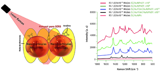 Cuando la luz incide sobre una molécula, la mayoría de los fotones se esparcen elásticamente, esto se conoce como esparcimiento Rayleigh. Pero hay una pequeña fracción de fotones, aproximadamente 1 de cada 106 fotones, que se esparcen en forma inelástica, esto es, sufren dispersión óptica a diferentes frecuencias de los fotones incidentes. A esta señal se le conoce como dispersión Raman y da lugar a la espectroscopía Raman. La señal, aunque muy pequeña, es una firma de la molécula que la produce y está definida por los enlaces que la forman, su estructura, esfuerzos sobre la muestra y el medio donde se encuentra. Estas características hacen de la espectroscopía Raman una técnica muy poderosa para la identificación de compuestos y el diseño de biosensores, siempre y cuando se pueda amplificar la señal.