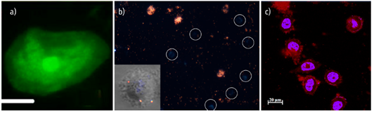 Figura 8 a) Células sanas obtenidas de la mucosa oral marcadas con puntos cuánticos de CdTe sin conjugar, imagen tomada con microscopio de epifluorescencia, la barra de escala es 5 μm; b) NPs de oro tipo estrellas conjugadas para marcar células cancerígenas A-431 obtenida por microscopía óptica sensible a la polarización (el polarizador de entrada y el de salida están perpendiculares; los círculos blancos indican células sanas que no fueron marcadas. El recuadro muestra la internalización celular de NPs de oro reportado anteriormente (Aaron et al., 2008); c) microscopía confocal de células SKBR3 (cáncer de mama HER2 positiva) con su núcleo marcado con el colorante Hoecht (azul), y nanoconjugados NaYF4:Yb,Er-Herceptin (rojo).