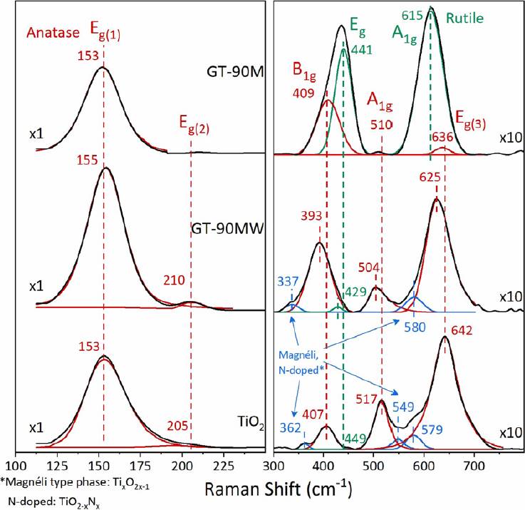 Figura 7 Espectros Raman y curvas de ajuste para TiO2 y muestras sintetizadas a 90 °C. (*Fase tipo Magnéli: TiXO2X-1. N-dopado: TiO2-XNX).