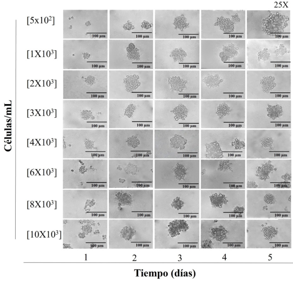 Para poder determinar la concentración de células/mL que generan las formaciones de osteoesferas, primero se observaron las características de crecimiento de estas en la línea celular, los datos mostraron que estas células en condiciones de adherencia forman monocapas homogéneas, estables, viables y con alta capacidad proliferativa. Bajo condiciones de cultivo en suspensión y a lo largo de 5 días y a diferentes concentraciones, se forman estructuras esféricas a partir de las 24 horas, esto se observa en todas las condiciones del ensayo mostrando, sin embargo, la heterogeneidad en la forma y tamaño de los osteoesferoides incrementa y es dependiente de la concentración creciente de las células utilizadas para cada condición, además, se observa también la presencia de coagregados celulares a mayor concentración, siendo [8 × 103], [10 × 103] células/mL donde se presenta esta característica (Figura 1).