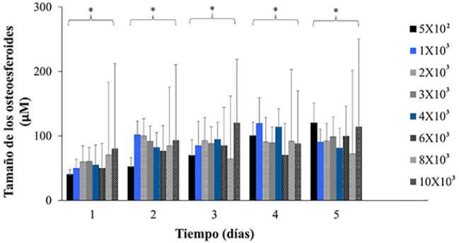 El resultado de las mediciones respecto al tamaño de los osteoesferoides mostró que a concentraciones de [5 × 102], [1 × 103], [2 × 103], [3 × 103], [4 × 103], [6 × 103] células/mL hay una mayor homogeneidad en el tamaño de estas estructuras. Mientras que las condiciones de cultivo con concentraciones mayores de [8 × 103], [10 × 103] células/mL muestran esferoides de mayor tamaño rebasando los 170 µm debido a la coagregación celular; por otra parte, en estas dos condiciones también se observan estructuras que no pasan de los 80 µm, observando estructuras que difieren significativamente en forma y tamaño, las cuales se formaron bajo las mismas condiciones de cultivo (Figura 2). Estos datos sugieren que el número de células es determinante para observar la formación de esferoides sin agregados celulares. Para esta línea celular, las concentraciones menores son las indicadas para la formación de osteoesferoides homogéneos durante 5 días.