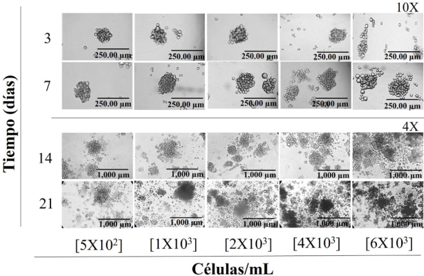 Figura 3 Fotomicrografía (10X y 4X) de la formación de esferoides de las líneas celulares hFOB 1.19. (osteoblastos) a diferentes concentraciones celulares durante 3, 7, 14 y 21 días.
