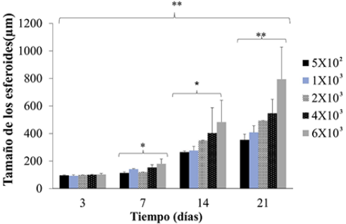 El tamaño de las esferas fue determinado usando el programa ImageJ y tomando el diámetro de estas para el análisis a 3, 7, 14 y 21 días. Los datos son presentados como la media ± ES (n = 3). Los asteriscos indican las diferencias significativas (*p < 0.05 y **p < 0.01) determinadas por la prueba de ANOVA y con post hoc de Tukey.