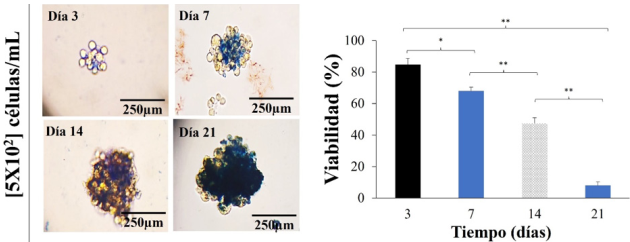 La viabilidad celular en los osteoesferoides es indispensable para el uso de estos modelos de estudio en pruebas de nanofármacos y nanomateriales. Los experimentos mostraron que las células disgregadas de los osteoesferoides formados a partir de [5 × 102] células/mL mantiene una viabilidad mayor al 70% hasta a los 7 días de formación; sin embargo, disminuyen su viabilidad a los 14 y 21 días observándose osteoesferoides poco cohesivos, fácil a la disgregación bajo manipulación para la tinción y un área de tinción con azul tripano por arriba del 70% en los remanente de estos a los 21 días de formación, sugiriendo que estos ya no son viables (Figura 5).