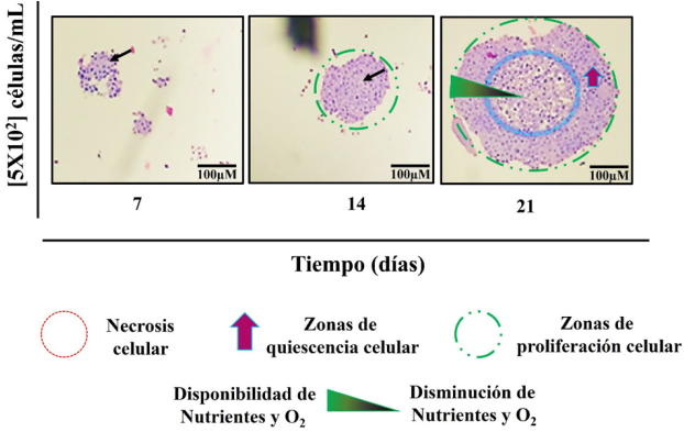Existen varios reportes indicando los cambios que se suceden en los modelos tridimensionales. Algunos autores indican el tener estas estructuras avasculares limitaciones de difusión, particularmente O2 en estructuras de hasta 200 μm, incluso se indica haber un transporte masivo ineficiente conduciendo la acumulación de desechos metabólicos, por lo cual un tamaño superior a 500 μm de diámetro suele mostrar una estructura en forma de capa comprendiendo un núcleo necrótico rodeado por un borde viable, el cual consta de una capa interna de células inactivas o quiescentes y una capa externa de células en proliferación; sin embrago, en otras propuestas se observa el cocultivo con células endoteliales creando un ambiente favorecedor de la microvasculatura (Hu y Li, 2007; Curcio et al., 2007; Lin y Chang, 2008; Fennema et al., 2013; Sánchez Escamilla, 2021).
