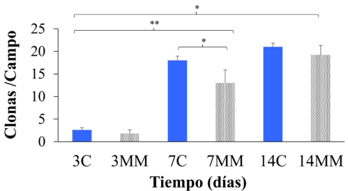 Los osteoesferoides formados con una concentración de [5 × 102] células/mL, los cuales fueron considerados como clonas, son aquellos con un tamaño ≥ a 50 µm. Los datos mostraron un número disminuido de clonas por campo a los tres días del ensayo; no obstante, a los 7 y 14 días estos cultivos mostraron un incremento significativo en el número de clonas cumpliendo los criterios de tamaño (≥ a 50µm) considerados en estos ensayos. Por otra parte, las clonas no tienen diferencias significativas, tanto en la morfología como en el número de colonias respecto a las que se formaron con el medio mineralizante respecto al control (Figura 7).