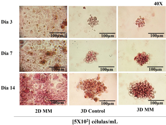 Ensayos de tinción con alizarina roja. Con la finalidad de observar la formación de nódulos mineralizados por la deposición de calcio, se llevaron a cabo ensayos a 3, 7 y 14 días en cultivos en suspensión y cultivos bidimensionales, utilizando una concentración [5 × 102] células/mL y 1 × 105 células por pozo respectivamente, tanto con medio basal como con medio inductor.