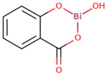 El SSBi es una sal básica de ácido salicílico unido a un catión de bismuto trivalente, cuya fórmula química es C7H5BiO4 (Figura 1). Es un polvo blanquecino con un peso molecular de 363.00701 g/mol, una densidad de 0.43 g/cm3, y cada molécula contiene 58% de bismuto y 42% de salicilato en peso (Budavari, 1996). Esta sal básica se obtiene a partir del salicilato de bismuto por medio de hidrólisis, es soluble en ácidos, alcalinos y aceites, e insoluble en agua (< 1 mg/ml a 22 ºC) y alcohol (Arena, 1974; Lewis, 2007). Es considerado como moderadamente tóxico con una probable dosis letal oral en humanos de 0.5- 5 g/kg (Gosselin, 1976).