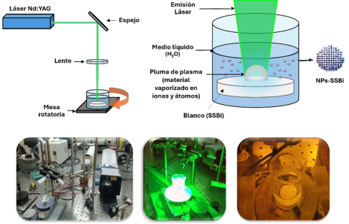 Las NPs-SSBi se obtuvieron mediante la técnica de ablación láser de sólidos inmersos en líquidos (ALSL), siguiendo los parámetros previamente reportados por nuestro grupo de trabajo (Reyes-Carmona et al., 2023), descritos en la Tabla 2. Brevemente: se utilizó un láser de Neodimio: YAG (Nd:YAG) dirigido a través de una serie de espejos hacia una lente para enfocar la luz hacia la superficie de una pastilla de SSBi, obtenida por compactación del polvo, inmersa en medio líquido (agua estéril). La pastilla se encontraba en movimiento rotatorio (15 rpm) para lograr irradiar diferentes zonas de la superficie de la pastilla. Una vez que el láser hizo contacto con el blanco de SSBi, se formó un plasma condensándose rápidamente dentro del agua, produciendo la suspensión coloidal de las NPs-SSBi. El principio y el montaje experimental se muestran en la Figura 2.
