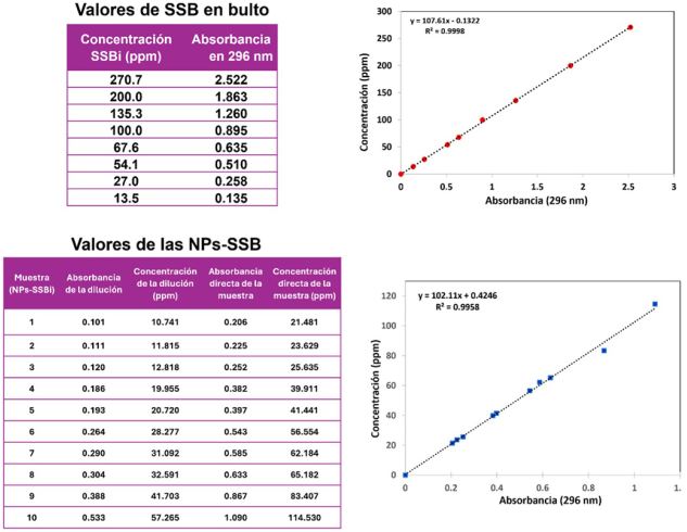 La parte superior, corresponde a los valores de concentración y absorbancia SSBi en bulto, que posteriormente fueron relacionados para crear la segunda curva de calibración con las NPs-SSBi, en ambos casos se obtuvieron valores de R2 mayores a 99.