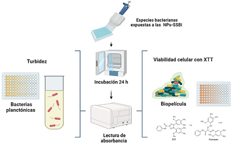 Figura 3 Representación de los ensayos realizados para evaluar el efecto antibacteriano de las NPs-SSBi, ensayos de turbidez y XTT.