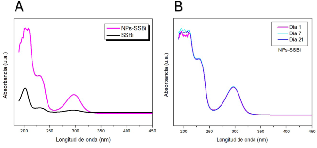 Por medio de espectroscopía ultravioleta-visible (UV-Vis) se identificó la presencia y estabilidad de las NPs-SSBi en suspensión comparadas con el SSBi en bulto. Se utilizó un espectrofotómetro LAMBDA UV/Vis/NIR (PerkinElmer®) en la longitud de onda de 200-600 nm, y agua estéril como línea base. Para analizar la estabilidad de la suspensión coloidal, se hicieron mediciones a 1, 7 y 21 días.