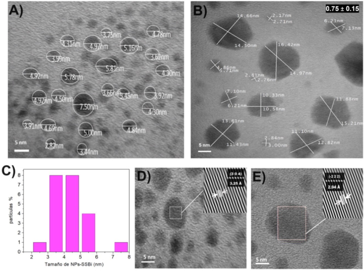 El tamaño, morfología y factor de forma de las NPs-SSBi se analizaron mediante microscopía electrónica de transmisión (TEM). Se utilizó un microscopio electrónico de transmisión (JEOL-2010 operado a 200 kV). Y las distancias interplanares se determinaron utilizando TEM de alta resolución (HRTEM) y el análisis de datos mediante el software Digital Micrograph de GATAN.