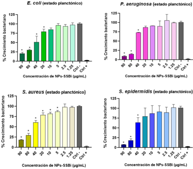 Figura 6 Porcentaje de crecimiento bacteriano en estado planctónico de las cuatro bacterias nosocomiales expuestas a diferentes concentraciones de NPs-SSBi, *, P < 0.05 vs Ctrl- (bacterias cultivadas en TSB). Ctrl + (bacterias cultivadas en TSB y clorhexidina 0.2%).