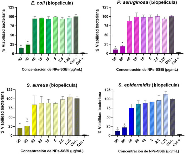 Con respecto al porcentaje de viabilidad de las bacterias adheridas a la superficie del pozo de cultivo (es decir, bacterias formando biopelícula) tras la interacción con diferentes concentraciones NPs-SSBi, se observó que solo las concentraciones más altas (80 y 90 µg/mL) lograron una reducción significativa de la viabilidad bacteriana (Figura 7). Específicamente a estas concentraciones se calculó una inhibición de la viabilidad bacteriana en E. coli del 75 y 84%, en P. aeruginosa del 80 y 89%, en S. aureus del 73 y 79%, y en S. epidermidis del 78 y 88%.