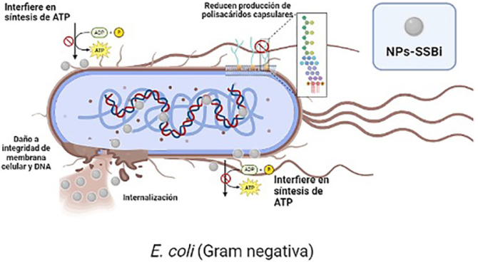 Figura 8 Posible mecanismo de acción de las NPs-SSBi contra bacterias Gram negativas como E. coli.