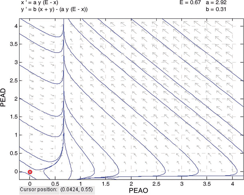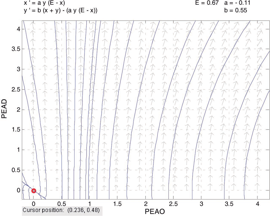 Una breve interpretación en función del fenómeno modelado: dado que la PEAO (variable x) y la PEAD (variable y) no pueden tomar valores negativos en el fenómeno del mudo real, el análisis sólo se puede hacer en el primer cuadrante (el cuadrante positivo) de la Figura 17, de modo que en la gráfica de la Figura 18, graficamos sólo el primer cuadrante de la gráfica 17. Así, podemos ver que cuando x es mayor que 0 pero menor que 0.67, hay una dinámica inversa no proporcional entre x e y, pero cuando x = 0.67, entonces y = x; finalmente, cuando x > 0.67 hay una dinámica inversa no proporcional entre x e y, la cual se acentúa más conforme crece el valor de x. Lo anterior determina la evolución de las variables PEAO y PEAD al transcurrir el tiempo. Es decir, en la gráfica de la Figura 18 podemos ver la evolución de las variables para todos los valores positivos de PEAO entre 0 y 4 millones de personas, y todos los valores positivos de PEAD entre 0 y 4 millones de personas.