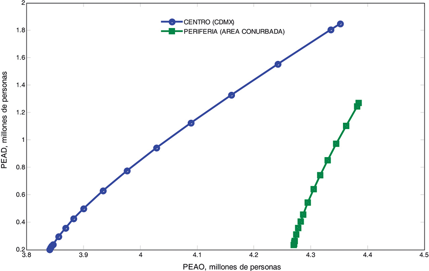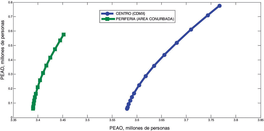 Esta Figura nos indica, asimismo, que hay una relación directa no proporcional entre las variables (PEAO vs. PEAD) de ambas zonas, las pendientes de sus respectivas curvas, también, positivas, pero más inclinadas que en el año 2000. Igualmente, un ejemplo de la lectura de la gráfica es: cuando hay 3.9 millones de PEAO en la CDMX, simultáneamente hay 0.5 millones (500,000) de PEAD (personas desempleadas); cuando hay 4.3 de PEAO en el área conurbada (municipios del Estado de México y Tizayuca), simultáneamente hay, también, 0.5 millones (500,000) de PEAD (personas desempleadas).