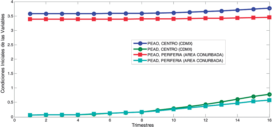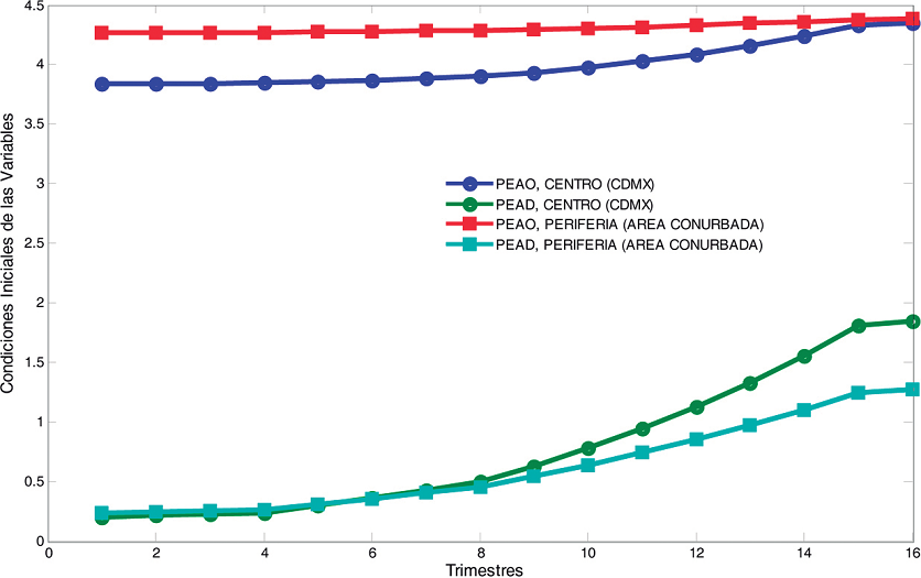 La Figura 12 nos muestra que ahora, a diferencia del 2000, tanto la PEAO como la PEAD y, en consecuencia, la PEA son mayores en la periferia que en el centro. Igual que en el 2000, el comportamiento de las variables en el centro (CDMX) es casi paralelo, pero a partir del tiempo 4 la PEAD comienza a crecer, primero lentamente, pero después se acelera, y crece más rápido que la PEAO; en el caso de la periferia (área conurbada) se observa algo semejante, pero el ritmo de la PEAD es más pronunciado que el de la PEAO, mostrando un ascenso, cada vez más acelerado, a partir del tiempo 4. De manera análoga a lo que se hizo con el año 2000, se muestra en el Cuadro 9 el cálculo de la PEA con los datos arrojados por el modelo y la gráfica respectiva.