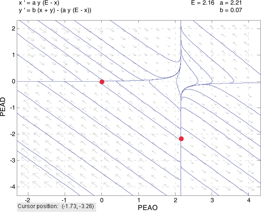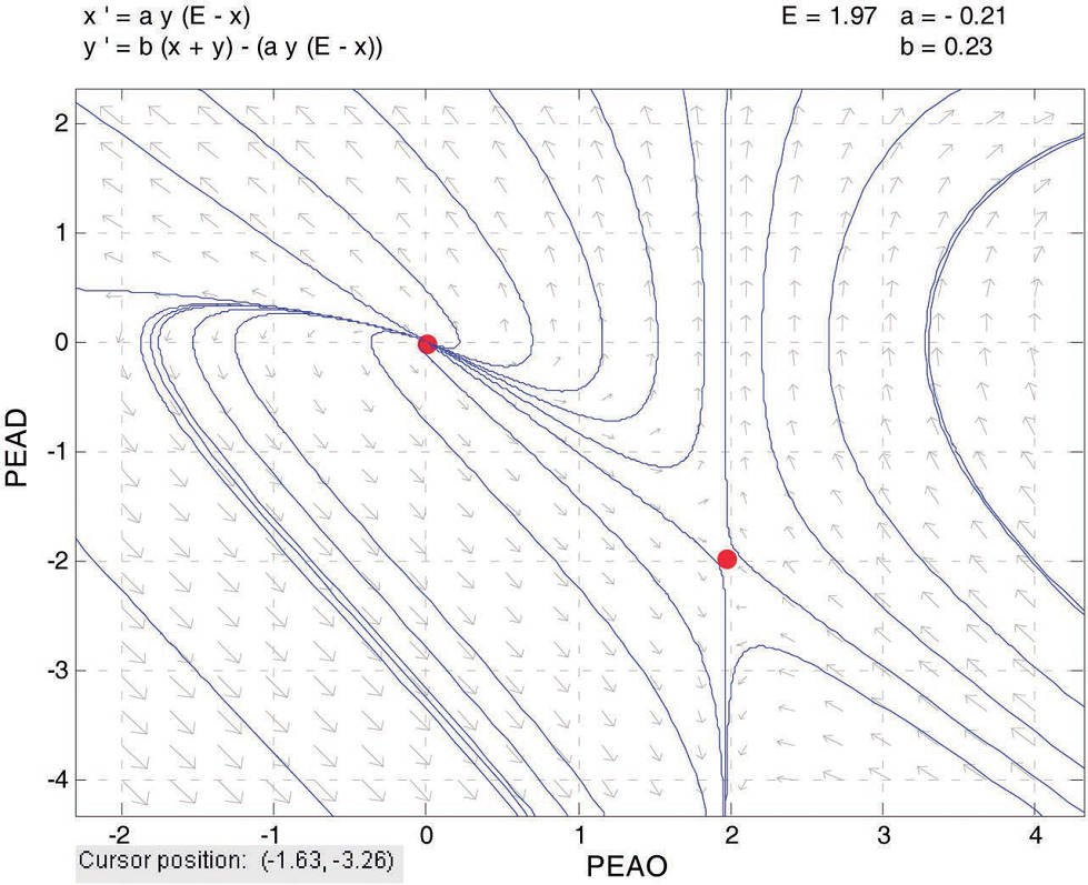 En la Figura 15 podemos apreciar que el sistema 1 (CDMX) para los valores señalados de los parámetros ( e = 2.15, a = 2.21 y b = 0.07) también tiene dos puntos de equilibrio, donde P 1 (0, 0) es una silla y P 2 (2.16, -2.16) es una fuente. También podemos ver con mayor claridad la dinámica no-lineal que se genera, con la evolución del tiempo, de la interacción entre las dos variables de la PEA (PEAO y PEAD). Al igual que en los sistemas anteriores, sabemos que PEA = PEAO + PEAD es una igualdad contable, los valores de la misma están cambiando constantemente con el transcurrir del tiempo en función no sólo de los valores iniciales de las variables sino de los valores que toman los parámetros citados, principalmente el parámetro e (nivel de empleo remunerado), el cual es el parámetro de control del sistema porque dependiendo de su valor cambia el patrón cualitativo del sistema. También podemos decir que ambos puntos de equilibrio son inestables y se conectan sus respectivos campos de dirección porque la parte derecha del campo de dirección de la silla te arroja a la parte izquierda del campo de dirección de la fuente. Pero finalmente, al transcurrir el tiempo, las variables se alejan de ambos puntos de equilibrio.