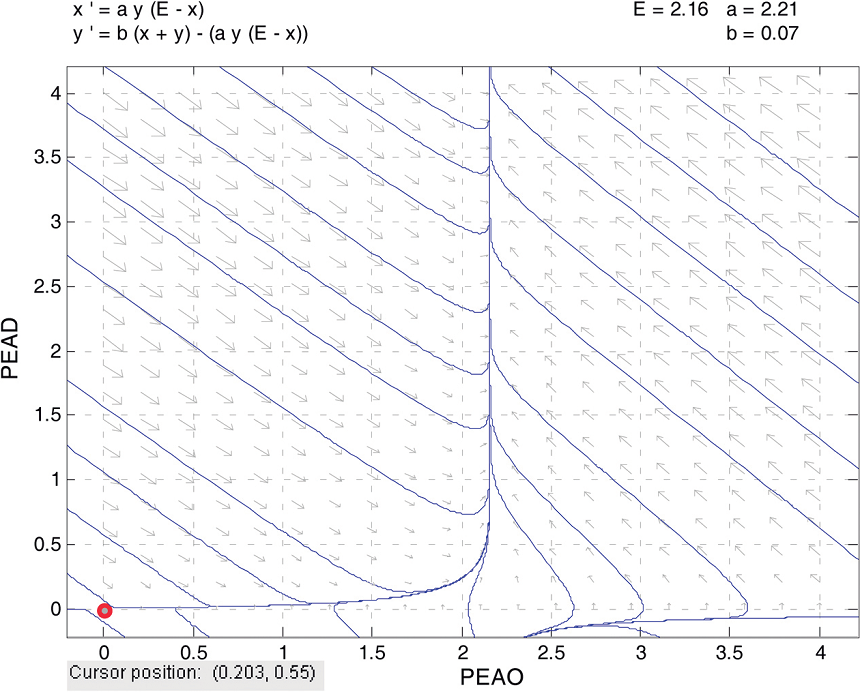 Una breve interpretación en función del fenómeno modelado: dado que la PEAO (variable x) y la PEAD (variable y) no pueden tomar valores negativos en el mundo real, el análisis sólo se puede hacer en el primer cuadrante (el cuadrante positivo) de la Figura 15, de modo que en la Figura 16 graficamos el primer cuadrante de la gráfica de la Figura 15. Así, podemos ver que cuando x es mayor que 0 pero menor que 2.16 hay una dinámica inversa no proporcional entre x e y, pero cuando x = 2.16, en principio, hay una dinámica directa no proporcional, pero después y = x; finalmente, cuando x > 2.15 hay una dinámica inversa no proporcional entre x e y, la cual se acentúa más conforme crece el valor de x. Lo anterior determina la evolución de las variables PEAO y PEAD al transcurrir el tiempo. Es decir, en la gráfica de la Figura 16 podemos ver la evolución de las variables para todos los valores positivos de PEAO entre 0 y 4 millones de personas, y todos los valores positivos de PEAD entre 0 y 4 millones de personas.