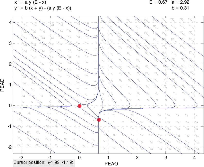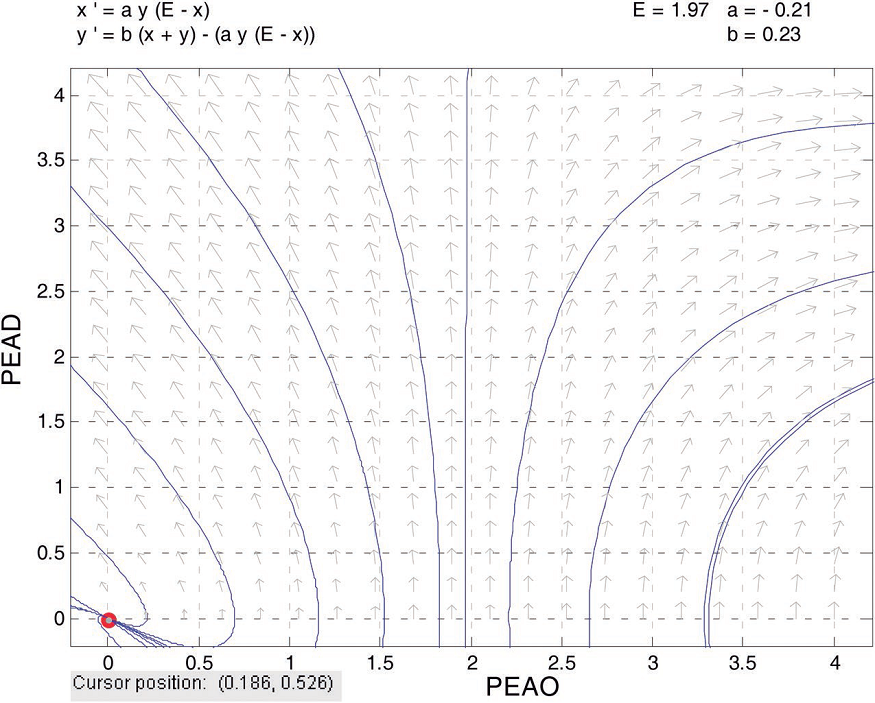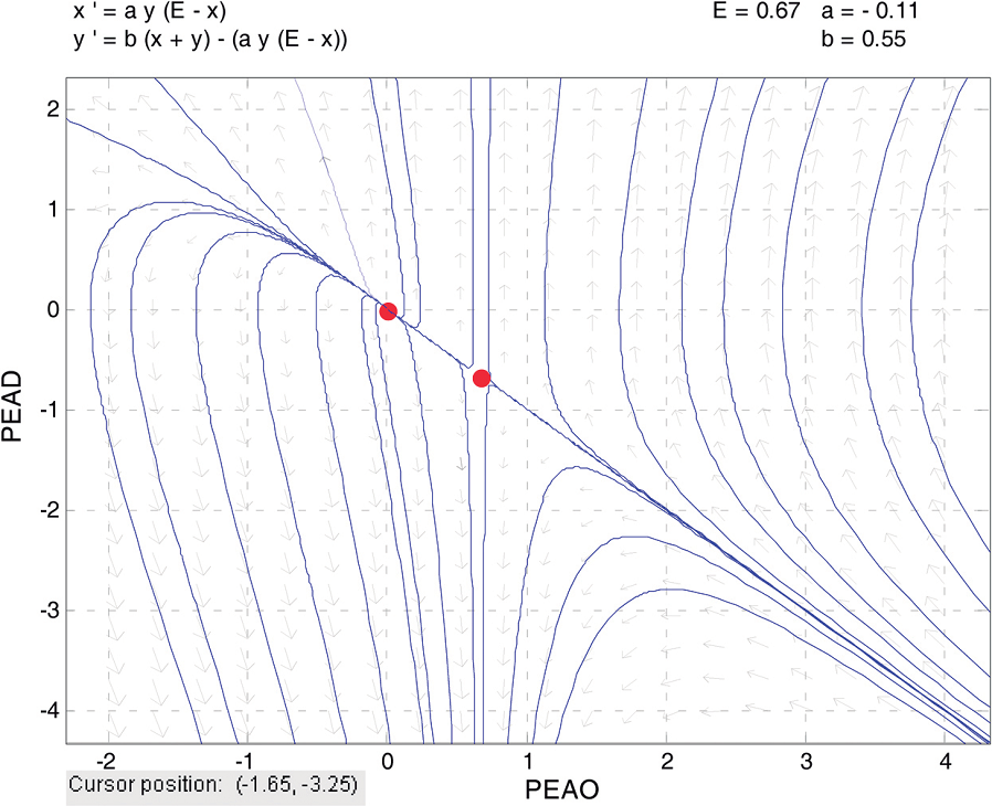 En la Figura 17 podemos apreciar que el sistema 2 (área conurbada) para los valores señalados de los parámetros ( e = 0.67, a = 2.92 y b = 0.31) también tiene dos puntos de equilibrio, donde P 1 (0, 0) es una silla y P 2 (0.67, -0.67) es una fuente. También podemos ver con mayor claridad la dinámica no-lineal que se genera, con la evolución del tiempo, de la interacción entre las dos variables de la PEAO (PEAO y PEAD). Al igual que en los sistemas anteriores, sabemos que PEA = PEAO + PEAD es una igualdad contable, los valores de la misma están cambiando constantemente con el transcurrir del tiempo en función no sólo de los valores iniciales de las variables sino de los valores que toman los parámetros citados, principalmente el parámetro e (nivel de empleo remunerado), el cual es el parámetro de control del sistema porque dependiendo de su valor cambia el patrón cualitativo del sistema. También podemos decir que ambos puntos de equilibrio son inestables y se conectan sus respectivos campos de dirección porque la parte derecha del campo de dirección de la silla te arroja a la parte izquierda del campo de dirección de la fuente. Pero finalmente, al transcurrir el tiempo, las variables se alejan de ambos puntos de equilibrio.