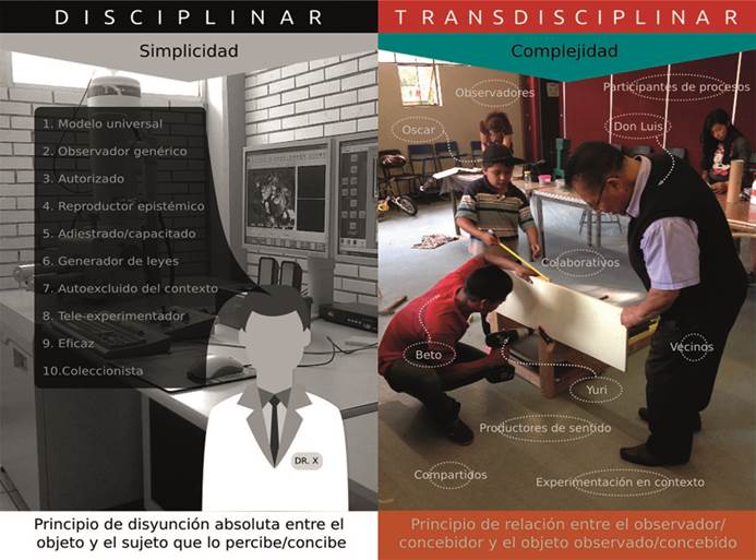 En el marco de esas tres dimensiones anteriores, hay cuatro espacios que aborda la presente reflexión, que son: el disciplinar, el del investigador/proyectista/sujeto, el conceptual y el de conformación de equipos. El disciplinar se construye desde la demarcación general de nuestros ámbitos de acción y trabajo, de la manera en cómo entendemos que se configura nuestra identidad profesional. La dimensión del investigador/proyectista/sujeto se articula desde una problematización de la forma en la que los procesos contextuales y subjetivos influyen en los intereses de trabajo y en la conformación de relaciones. El conceptual, expone algunas ideas sobre la investigación interdisciplinaria y transdisciplinaria, a la vez que se suscribe una posición en relación a cómo es posible materializarlas. El de los equipos de trabajo busca discutir dos experiencias de relacionamiento y organización entre personas con adscripciones disciplinarias distintas, acá el énfasis está puesto en las tensiones y las posibilidades que estas brindan.