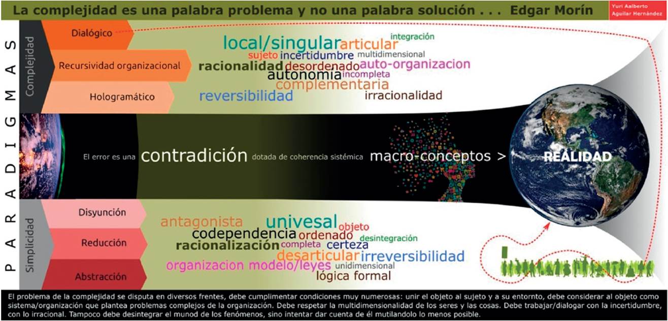 La siguiente imagen nos permite visualizar por un lado la contrastación entre los paradigmas conceptuales de la ciencia que hoy están en acción. La simplicidad de las ciencias tradicionales caracterizadas principalmente por la operación disyuntiva, el reduccionismo monolítico y la abstracción especializada. En contraste con la complejidad de las nuevas ciencias cimentadas en procesos dialógicos, bucles recursivos de sistemas organizacionales adaptativos y concienzudamente hologramáticos.