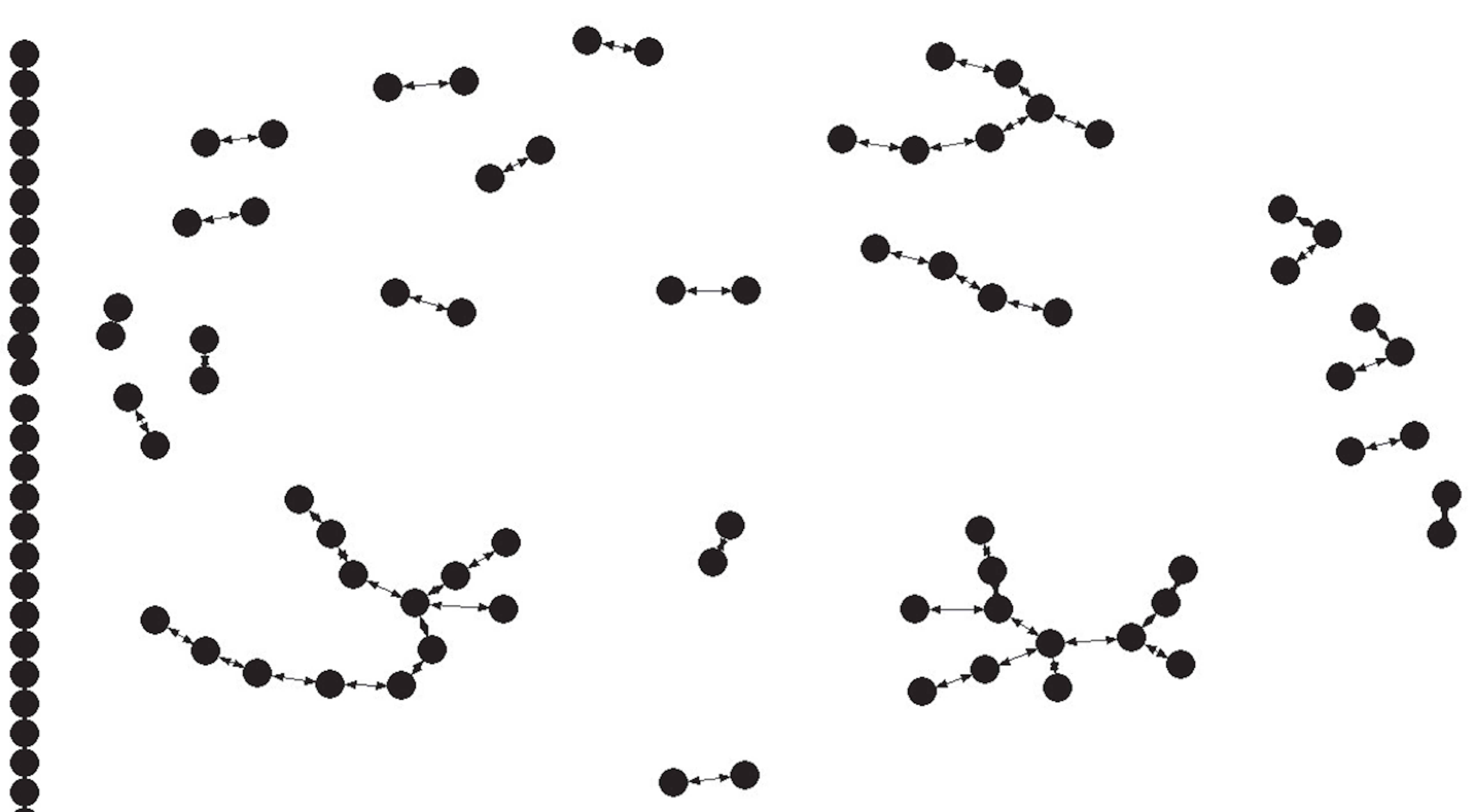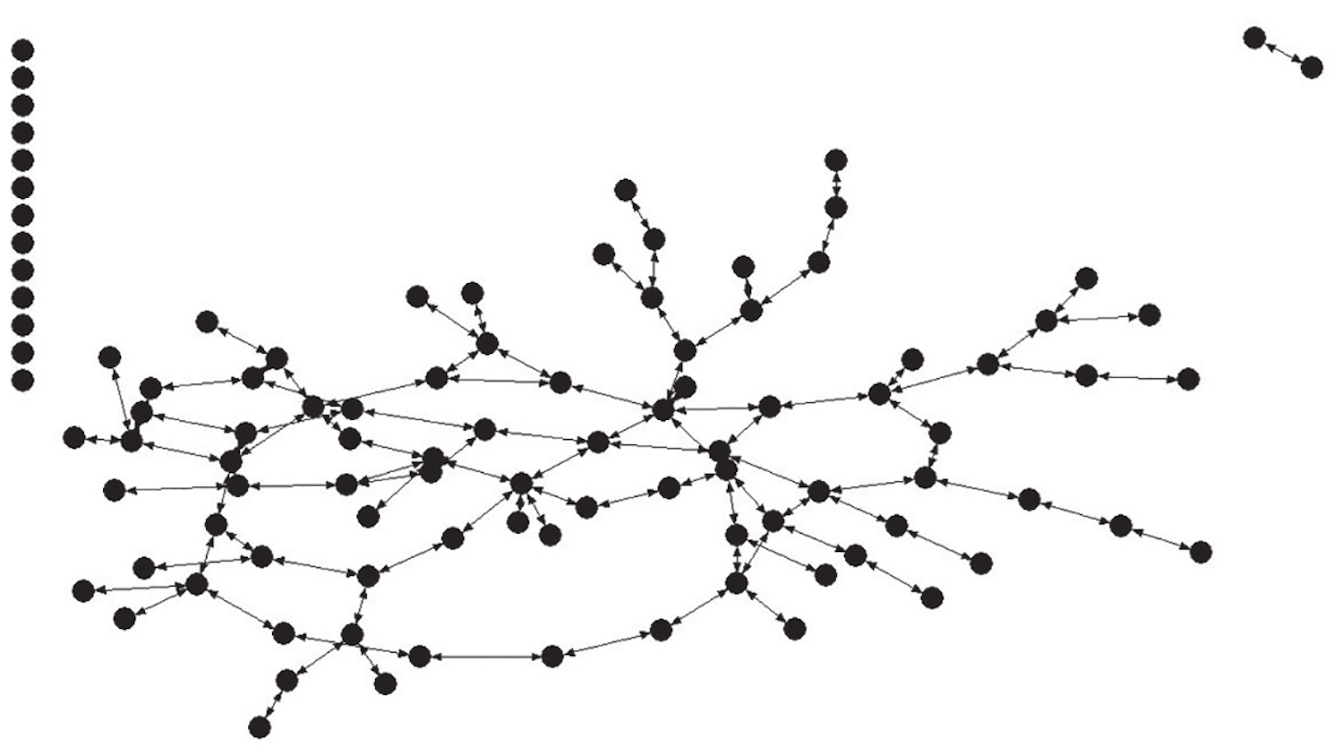 Una modelización muy utilizada y que puede resultar útil para elaborar medidas o indicadores de estructuración social es la de redes aleatorias (o grafos aleatorios). Los matemáticos Paul Erdös y Alfréd Renyi (1959) idearon un modelo matemático conocido como Erdös-Renyi (ER) para la generación de redes aleatorias.17 En este modelo, los nodos que se van agregando sucesivamente a una red tienen igual probabilidad que el resto de la red de conectarse con otros (es decir, se agregan con independencia estadística unos de los otros), presentando una distribución de Poisson. Sin embargo, buena parte de las redes de la vida real (Internet, redes de citas, y otras) se comportan como redes libres de escala (o bien presentan una distribución de grado exponencial), de ahí que la representación que ofrece el modelo ER sea limitada al aplicarse al mundo social empírico. Este modelo ER suele ser seguir patrones de conexión aleatorios, que podrían ser comparados con patrones sociales observados.18 En contraste, las redes sociales humanas no suelen seguir patrones aleatorios.19 Diversas instituciones, organizaciones jerárquicas y artefactos culturales generan patrones y algún grado de previsibilidad en las relaciones humanas. En el Gráfico 1 se visualiza una red aleatoria ER, con 100 nodos (50 lazos no orientados), densidad de 0.01 y grado promedio de 1.